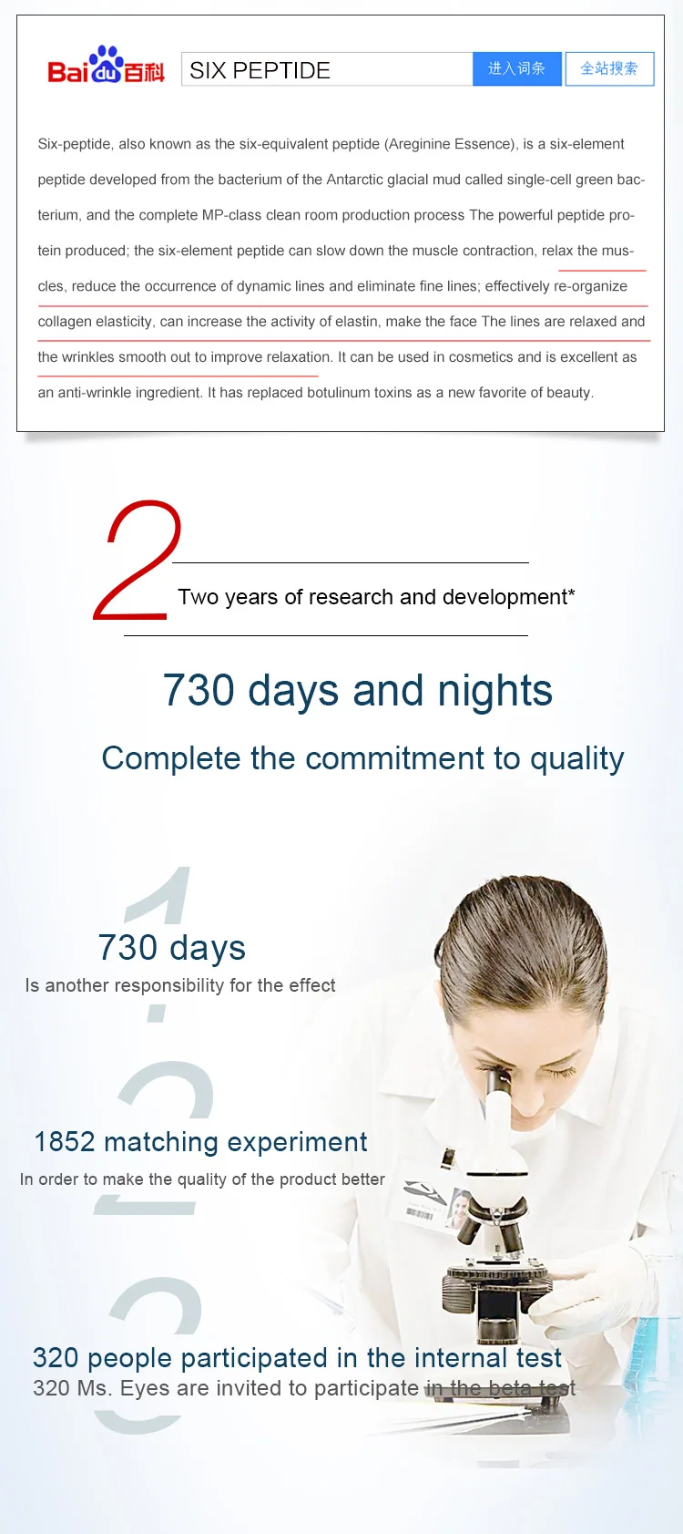 É um peptídeo de seis elementos desenvolvido a partir do bactério da lama glacial antártica chamada bactéria verde de célula única, que pode efetivamente aliviar e suprimir a testa, as linhas finas da cauda do peixe e a contração e atividade dos músculos ao redor, e ajudar os músculos.Relaxe e restaure o tecido elástico da pele para linhas suaves e suaves.